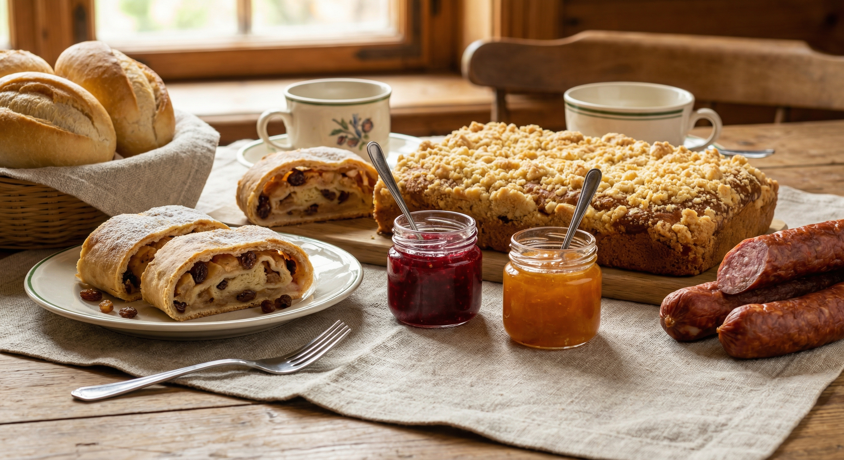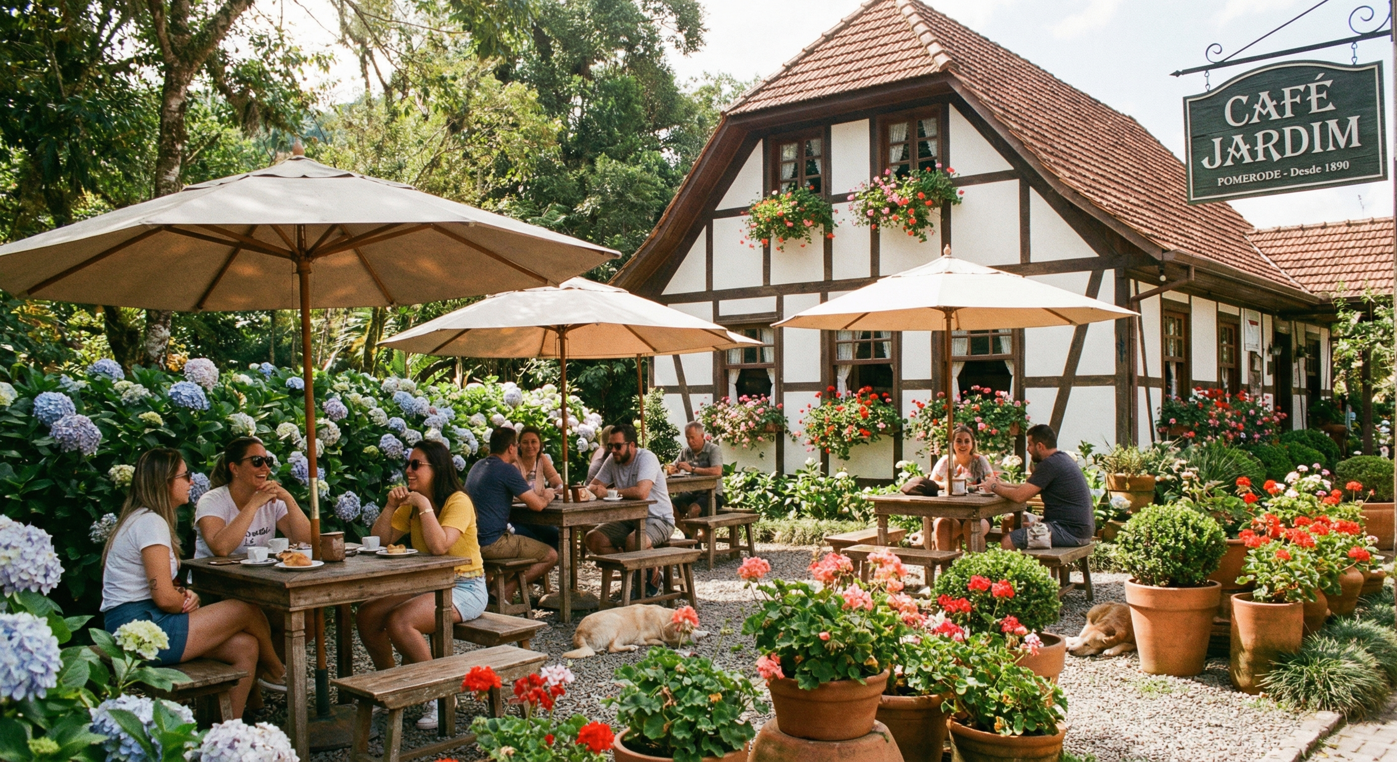Saboreie um autentico cafe colonial pomerano com mais de 40 itens artesanais, incluindo cucas, strudels, embutidos e geleias caseiras preparados com receitas de familia passadas por geracoes.